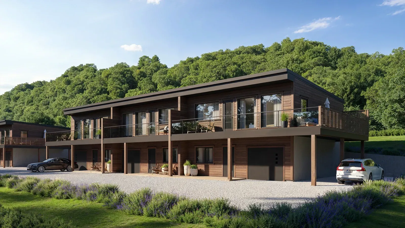 Hver boenhet disponerer egen integrert garasje. Beliggenheten er øverst i feltet Krokbekken panorama med kort kjørevei til servicetilbud, skole og barnehage